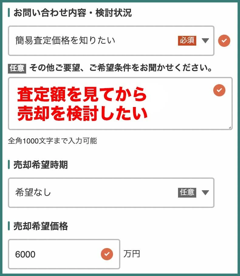 (私の場合は”査定額を見てから売却を検討したい”としました)