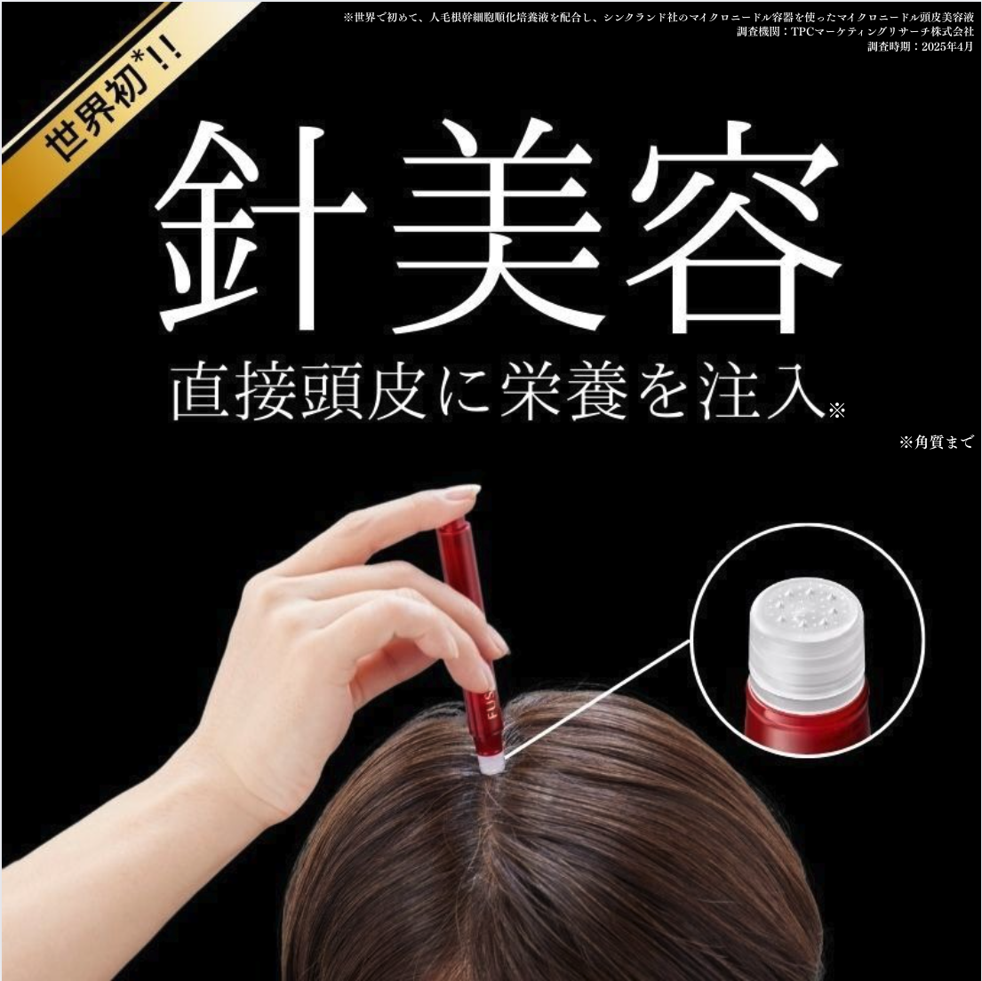 ※世界で初めて、人毛根幹細胞順化培養液を配合し、シンクランド社のマイクロニードル容器を使ったマイクロニードル頭皮美容液